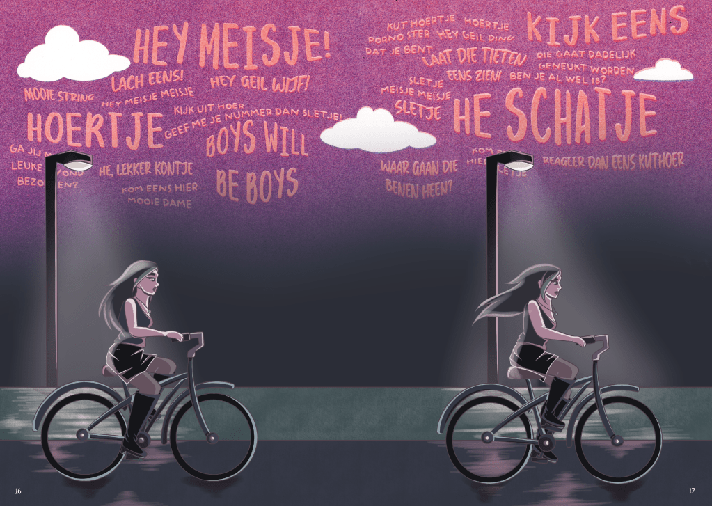Deze zine is mijn afstudeerproject van de kunstacademie Sint Joost Art & Design in Den Bosch. Ik had besloten om een zine te maken met een onderwerp dat me persoonlijk bezighoudt als vrouw en als studente. Ik had gekozen voor het onderwerp straatintimidatie en dan specifiek dat tijdens een nachtje uit.